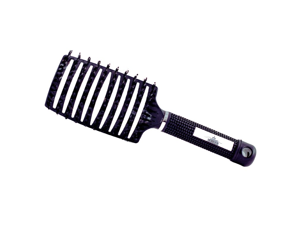 Nylonový kartáč černé barvy na vlasy má vlnité štětinky, jenž masírují vlasy i u kořínků a podporují tak růst vlasů. Rukojeť je vyrobena z gumy, pro lepší a pohodlnější držení. Rozměry kartáče jsou 250 x75 mm. Hřeben je vhodný na rozčesávání paruk,příčesků a tupé.Díky šetrným plastovým štětinkám vlasy z paruky a nebo z příčesu nevytrhávají.